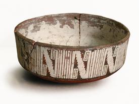 Contenedor abierto (escudilla) de perfil simple, de cuerpo cilíndrico, con labio de sección redondeada y base convexa. Superficie interna con engobe blanco, la externa con engobe en rojo y paredes en blanco decoradas con grecas escaleradas y lineas verticales paralelas, en colores marrón y rojo
