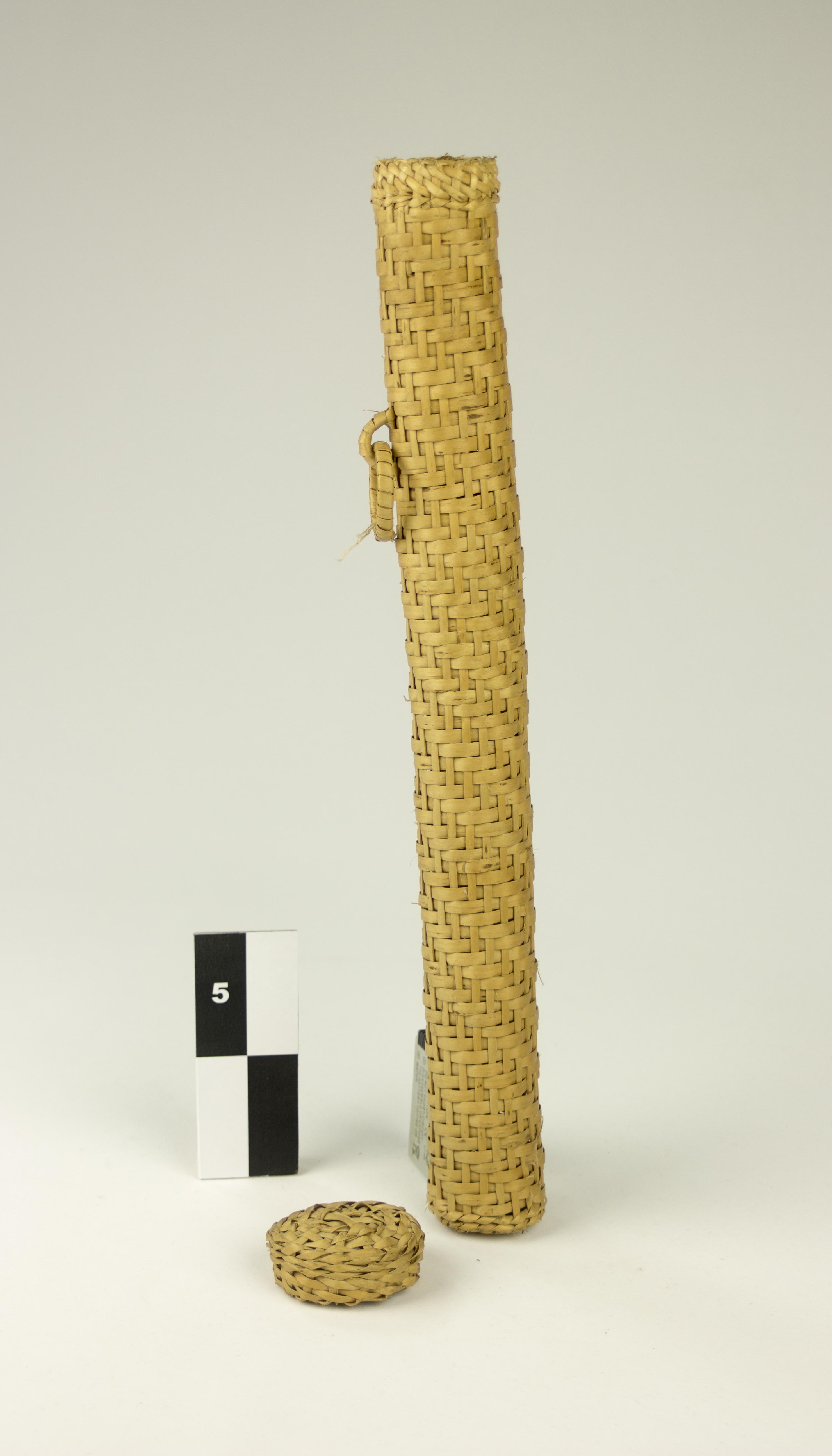 Objeto tubular con un lado cerrado y otro abierto para introducir palillos, tiene una tapa y una argolla en el costado superior, fabricado en fibra vegetal trenzado.