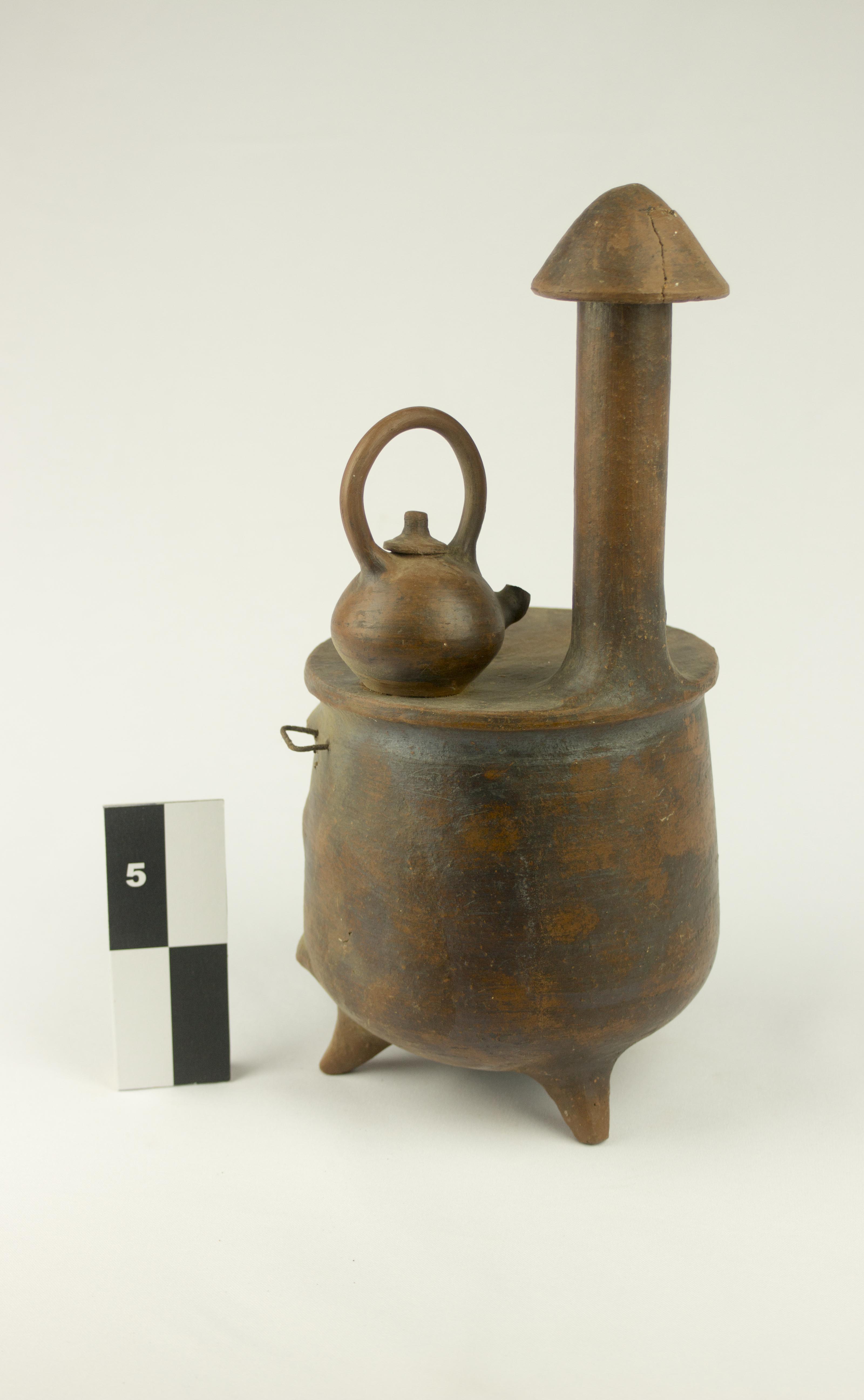Cocina a leña decorativa hecha en greda, bruñida y de color café. El conjunto consta de una cocina con 3 piezas (ollas y teteras), y posiblemente un cucharon que colgaba de un lado. Del juego de ollas y teteras sólo se encuentra la tetera, a la que le falta un trozo de pico.
