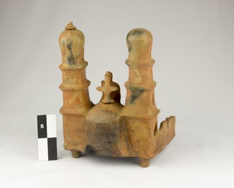 Reproducción en miniatura de iglesia hecha en greda, presenta la nave central con una escultura de un santo sobre ella y dos torres de campanario. Color rojizo.