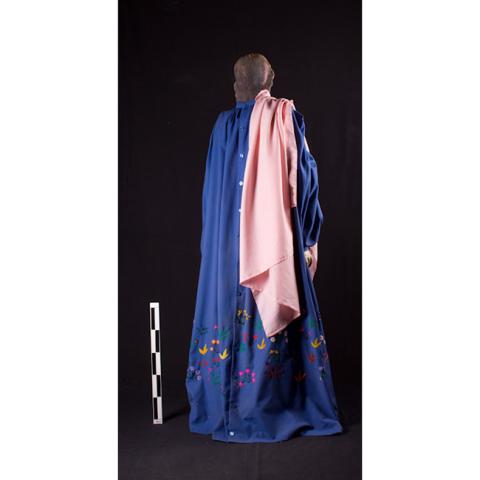 Figura femenina de candelero, de pie, tallada y policromada en cabeza y manos. Presenta ojos de vidrio de color marrón y su mirada se dirige hacia abajo, orientada hacia la derecha. El pelo está tallado hasta la altura de los hombros, es de color marrón y tiene una textura acanalada. La zona del pecho presenta una policromía de color rojizo. Los brazos están articulados en la zona del hombro y codo. Faltante de pulgar izquierdo. El bastidor está compuesto por cuatro listones de madera que se fijan a los extremos de una base en forma de cruz. La figura viste una túnica de color azul, abotonada en la zona posterior, con flores de colores bordadas en el ruedo. Bajo la túnica viste una blusa de color amarillo y una falda de color morado. Lleva un velo de color rosado con flores bordadas.