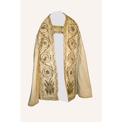 Vestidura litúrgica de forma semicircular, larga, de tela de color beige con trama de hilos metálicos, abrochada a la altura del pecho con una banda de tela rectangular que une los bordes de la capa con dos broches metálicos. En la zona delantera se distinguen dos cenefas anchas que recorren las dos caídas, con bordados en relieve de motivos vegetales, con hilos metálicos. En la zona posterior se halla el capillo de forma semicircular, con decoración bordada en relieve con hilos metálicos, de motivos vegetales dispuestos simétricamente. Todo el contorno del capillo que no va adherido a la capa lleva flecos metálicos de color dorado, alternando una sección de flecos delgados con uno grueso de forma helicoidal. La zona superior al capillo presenta decoración bordada correspondiente a la continuidad de las guardas que se observan por la parte delantera.