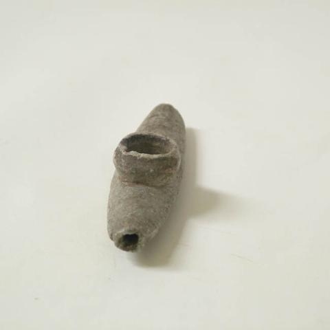 Artefacto fumatorio elaborado en piedra usado en contextos de ritualidad ceremonial, política y/o social de la Cultura Mapuche. Pipa de tipo T invertida, de cuerpo fusiforme, de bordes devastados y redondeados. Su hornilla es globular restringida y sobresale de la sección medial de la pieza, conectando las dos entradas opuesta del tubo de aspiración. Su superficie es pulida de color café sin decoraciones.