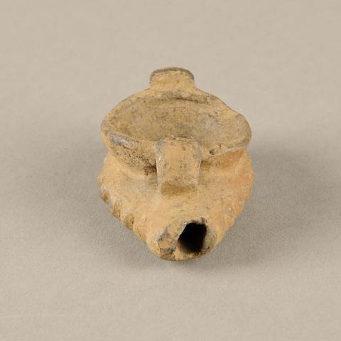 Artefacto fumatorio elaborado en cerámica usado en contextos de ritualidad ceremonial, política y/o social. Su tipología la clasifica en pipas de T invertida. De forma elíptica con bordes crenados. La hornilla se ubica al centro del cuerpo, sobresaliendo en forma discoidal abierta. Del borde del labio de la hornilla se apoyan dos asas cinta que terminan en el cuerpo central de la pieza. El tubo de aspiración parece concluir en dos boquillas, pero la fragmentacion de estas partes impide la identificación total de la pieza. Su superficie es alisada de color café claro.