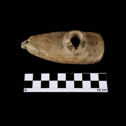 Artefacto fumatorio elaborado en cerámica usado en contextos de ritualidad ceremonial, política y/o social de la Cultura Mapuche. Su tipología se relaciona con las pipas de extensión ciega. De forma ovada tabular de base trunca con bordes redondeados. La hornilla se ubica en la mitad superior del cuerpo sobresaliendo en forma discoidal abierta. El tubo de aspiración concluye en una boquilla pequeña de forma cilíndrica. Su superficie es alisada de color natural café claro.