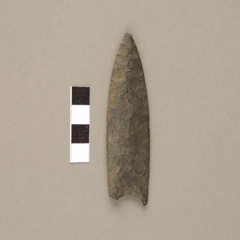 Herramienta lítica de caza y/o pesca confeccionada en roca basáltica, de color gris con anaranjados puntuales, de acabado opaco. Su forma corresponde a una punta de proyectil apedunculada de base cóncava con aletas destacadas. Limbo centro expandido, de forma lanceolada alargada con ápice normal. Huellas de lascado por ambas caras. Su uso podría estar asociado a un arma arrojadiza. Cronológicamente puede estar adscrita al período arcaico. Territorialmente no se puede identificar su procedencia. Presenta fractura y faltante en aleta A6.
