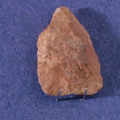 Herramienta lítica confeccionada en riolita, de color cafe anaranjado, de acabado opaco. Su forma corresponde a una punta de proyectil triangular apedunculada de base recta, usada en arma arrojadiza. Cronológicamente se puede adscribir al Holoceno.Territorialmente se puede asociar a la estepas y bosques patagónicos.