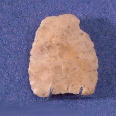 Herramienta lítica confeccionada en roca silícea de color blanco anaranjado, de acabado opaco. Su forma corresponde a una punta de proyectil apedunculada de base cóncava. Usada posiblemente en un arma arrojadiza. Cronológicamente se puede asociar al alfarero temprano. Territorialmente no se puede adscribir a un área determinada. Tiene una fisura transversal distal.