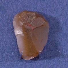 Herramienta lítica confeccionada en roca calcedonia, de color café acaramelado, levemente traslúcido y de acabado levemente brillante. Su forma corresponde a un raspador de filo frontal corto, confeccionmado en una lasca de arista. Su uso está relacionado a trabajos en cueros, principalmente tareas domésticas. Cronológicamente se puede asociar al Holoceno. Territorialmente está asociado a estepas y bosques de la patagonia.