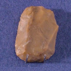 Herramienta lítica confeccionada en roca silícea, de color café claro, de superficie levemente brillante. Su forma corresponde a un raspador de filo frontal corto, confeccionado en una lasca de arista doble. Su uso está relacionado a trabajos en cueros, principalmente tareas domésticas. Cronológicamente se puede asociar al Holoceno. Territorialmente a las estepas y bosques de la patagonia.