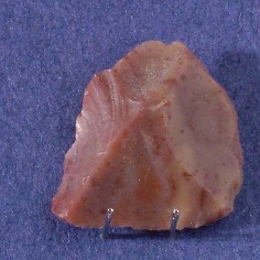 Herramienta lítica confeccionada en roca silícea, de color cafe acaramelado, de acabo superficial levemente brillante. Su forma corresponde a un raspador de filo frontal corto, confeccionado en una lasca angular. Su uso está relacionado a trabajos en cueros, principalmente tareas domésticas. Cronológicamente se puede asociar al Holoceno. Territorialmente a las estepas y bosques de la patagonia.