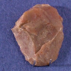 Herramienta lítica confeccionada en roca silícea, de color café rosa, de acabado opaco. Su forma corresponde a un raspador, confeccionado en una lasca angular. Su uso está relacionado a trabajos en cueros, principalmente tareas domésticas. Cronológicamente se puede asociar al Holoceno. Territorialmente está asociada a las estepas y bosques de la patagonia.
