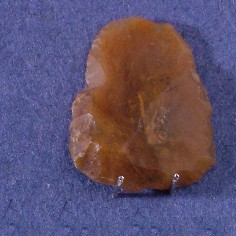 Herramienta lítica confeccionada en calcedonia, de color café caramelo, levemente traslúcida y levemente brillante. Su forma corresponde a un raspador de filo frontal corto, confeccionado en una lasca de arista. Su uso está relacionado a trabajos en cueros, principalmente tareas domésticas. Cronológicamente se puede asociar al Holoceno. Territorialmente está asociada a estepas y bosques de la patagonia.