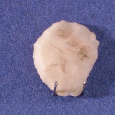 Herramienta lítica confeccionada en roca silícea, de color blanco opaco interrumpido por tonos café claro. Su forma corresponde a un raspador de filo frontal corto, confeccionado en una lasca. Su uso está relacionado a trabajos en cueros, principalmente tareas domésticas. Cronológicamente se puede asociar al Holoceno. Territorialmente está asociada a estepas y bosques de la patagonia.
