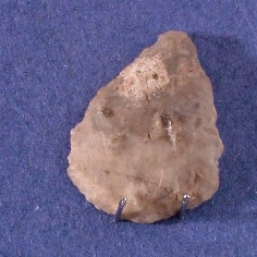 Herramienta lítica confeccionada en roca silícea, de color café claro, de acabado opaco. Su forma corresponde a un raspador de filo frontal corto, confeccionado en una lasca angular. Su uso está relacionado a trabajos en cueros, principalmente tareas domésticas. Cronológicamente se puede asociar al Holoceno. Territorialmente está asociada a estepas y bosques de la patagonia.