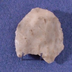 Herramienta lítica confeccionada sobre una punta de proyectil apedunculada, de roca silícea como materia prima, de corlor blanco gris, de acabado levemente brillante. Por su forma corresponde a una raspador de filo frontal corto. Su uso está relacionado a actividades cotidianas de raspado de cueros y madera. Cronológicamente no se puede asociar a un período o área en particular.