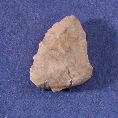 Herramienta lítica, confeccionada en roca silícea, de color blanco gris, de acabado opaco. Su forma es de una punta apedunculada triangular. Es una herramienta no terminada, presenta varios errores de talla que podrian deberse a un práctica de proceso de aprendizaje. Cronológica y territorialmente no se puede asociar a un período o área en particular.