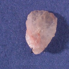 Herramienta lítica en proceso de confección, trabajada cuarzo, color rosado transparente, de acabado brillante. Se puede observar cara ventral. No se puede identificar su contexto cronológico ni territorial.