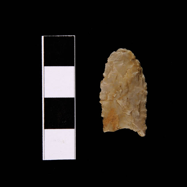 Instrumento lítico de caza o pesca de color café claro y anaranjado, de acabado mate. Limbo centro expandido de forma espatulada, ápice normal redondeado, base escotada faltándole una de sus aletas. Huellas de lascado por ambas caras.