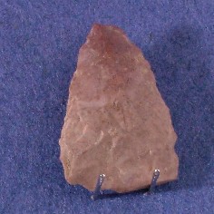 Herramienta lítica confeccionada en roca silícea, de color café rosado, de acabado opaco. Su forma corresponde a una punta de proyectil de base cóncava. Posiblemente su manera de propulsión sea flecha. Cronológica y territorialmente no se puede asociar a un período y área determinada.