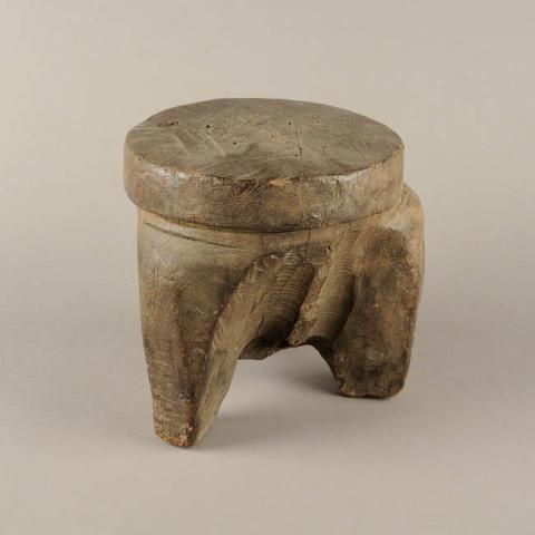 Asiento elaborado en una pieza de madera nativa de uso domestico, social y ceremonial. De forma cilindrica de superficie discoidal y base constituida por tres pies rectos con bordes redondeados, con algunas formas constitutivas decorativas a base de tallado. De superficie lisa, sin decoraciones y color cafe gris.