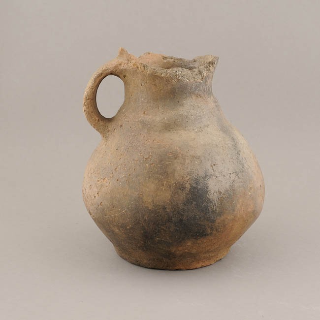 Vasija restringida de perfil inflectado. Cuerpo de sección elipsoidal de cuello hiperboloide, dos asas cinta que nacen ene l labio con una pequeña acanaladura central. Base completamente plana. SUperficie alisada de color café negruzco.