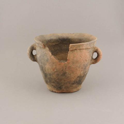 Vasija simétrica no restringida, de perfil inflectado. Cuerpo de sección tronco cónico invertido, borde reforzado evertido. Base completamente plana y dos asas cinta en arco lisa (sección circular). Superficie alisada monocroma de color café y anaranjado.