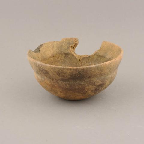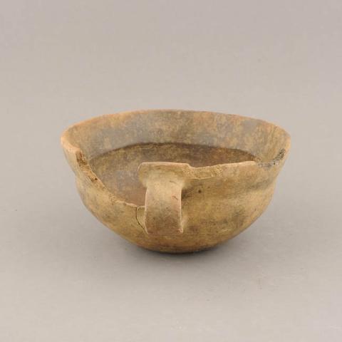 Contenedor abierto de perfil simple. Tiene labio redondeado, cuello troncocónico invertido, cuerpo hemisférico y base curva. Posee un asa cita de orientación vertical en el cuerpo. Cerámica modelada y alisada de color marrón claro.