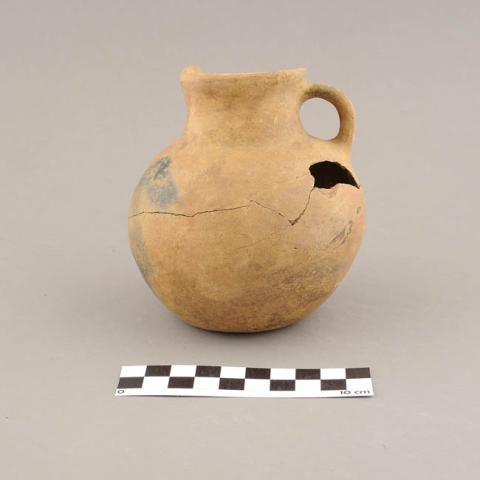 Vasija simétrica restringida con cuello de perfil compuesto. CUerpo de sección esferoidal, cuello hiperboloide y borde evertido. Su base es plana y presenta un asa conta que se emplaza bajo el borde. Superficie pulida monocroma de color café claro con una mancha negra en su cuerpo debido a la acción de fuego.