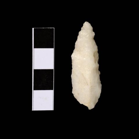 Instrumento lítico de caza o pesca de color blanco de acabado brilloso. Limbo tras expandido de forma oblonga, de ápice normal, base en arco. Huellas de lascado por ambas caras.