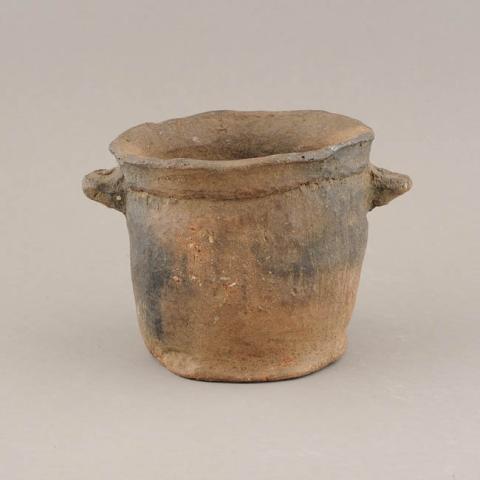 Vasija simétrica no restringida, de perfil simple. Cuerpo de sección cilíndrica, borde reforzado levemente evertido. Base plana y dos asas en arco emplazadas horizontalmente, de sección circular. Superficie alisada monocroma de color café.
