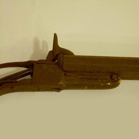 Arma de fuego portatil de mano. Constituida de empuñadura, mecanismos y cañón. Empuñadura, solo la estructura metálica con un remate en su parte posterior para adosar una anilla. Mecanismos de acero con sistema de disparo de chispa, doble martillo percutor, el caj´pon que lo aloja presenta grbado motivos vegetales. Cañon doble de acero, de cinco caras y parte inferior plana.