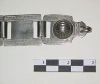 Objeto de forma rectangular oblonga, de uso personal femenino en la cultura Mapuche. Compuesto por una placa terminal de forma irregular y globulación central; 6 placas rectangulares y una placa inferior de forma semi circular de la que penden 5 pin circulares por medio de arandelas de alambre. Todas las placas están unidas entre sí por medio de arandelas planas soldadas a la plata. La placa inferior posee una globulación central, adherida a la placa por medio de soldadura a la plata. Los pin poseen una decoración por estampado con forma de insecto.