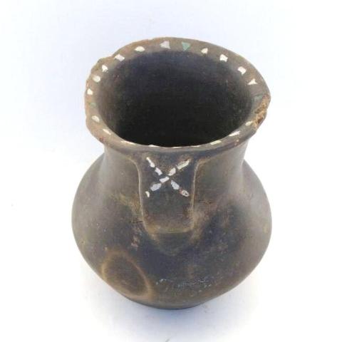Jarro simétrico, estructura restringida con cuello, perfil compuesto con un punto de esquina en la unión cuello-cuerpo. Forma de cuerpo elipsoide horizontal. Forma de cuello semi-hiperboloide. Tipo de borde evertido. Tipo de labio convexo-recto/biselado. Tipo de base plana-definida. Un asa en arco de correa, de sección subrectangular, emplazamiento borde/unión cuello-cuerpo. Tratamiento de superficie exterior: pulido. Tratamiento de superficie interior del cuello: pulido; cuerpo: alisado. Color exterior e interior: café oscuro. Decoración mediante la aplicación de 22 fragmentos de cerámica vidriada en el borde y mitad superior del asa. Alargamiento, redondeamiento y adhesión al cuerpo del extremo inferior del asa.