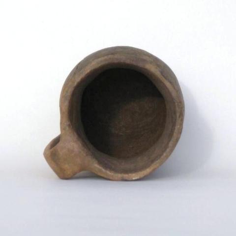 Jarro simétrico, estructura restringida con cuello, perfil compuesto con un punto de esquina en la unión cuello-cuerpo. Forma de cuerpo subesférico. Forma de cuello troncocónico invertido. Tipo de borde evertido. Tipo de labio recto (irregular). Tipo de base plana-definida. Un asa en arco de correa, de sección subrectangular, emplazamiento borde/sección superior del cuerpo. Tratamiento de superficie exterior: pulido. Tratamiento de superficie interior: alisado. Color exterior e interior: café. Presenta alargamiento, redondeamiento y levantamiento del extremo inferior-exterior del asa.