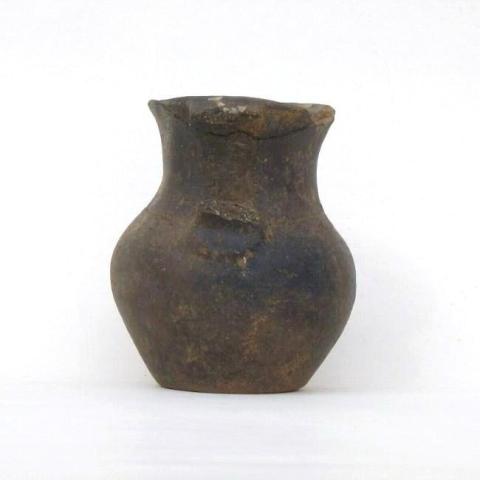 Jarro simétrico, estructura restringida con cuello, perfil inflectado (con un punto de inflexión). Forma de cuerpo ovoide vertical. Forma de cuello hiperboloide. Tipo de borde evertido. Tipo de labio biselado. Tipo de base plana/definida. Un asa con emplazamiento borde/unión cuello/cuerpo. Tratamiento de superficie exterior: pulido, base alisada. Tratamiento de superficie interior: cuello pulido y cuerpo alisado. Color exterior e interior: café oscuro. Presenta aplicación de fragmentos de cerámica vidriada (13) en el borde y en el asa, aunque faltan algunos por pérdida de soporte. Presenta una incisión anular irregular en la unión cuello/cuerpo, además de la incrustación de un fragmento irregular de vidrio en el centro de la base, como rasgo decorativo.
