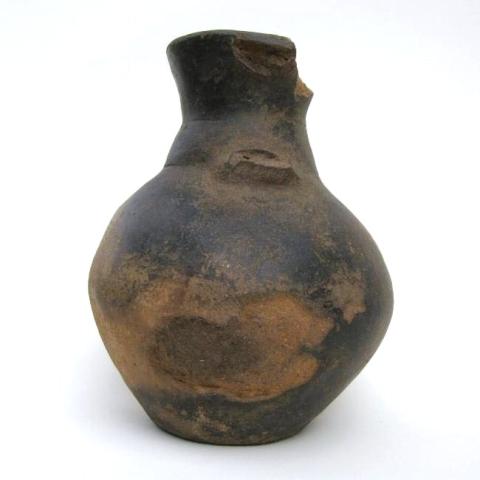 Pieza simétrica, estructura restringida con cuello, perfil compuesto (con un punto de esquina en la unión cuello-cuerpo). Forma de cuerpo elipsoide horizontal. Forma de cuello hiperboloide. Tipo de borde evertido. Tipo de labio recto-biselado. Tipo de base plana/definida. Emplazamiento asa (fracturada) borde-unión cuello cuerpo. Tratamiento de superficie exterior: pulido, base alisada. Tratamiento de supericie interior: cuello pulido, cuerpo alisado. Color exterior: café oscuro con manchas más claras. Color interior: negro y café oscuro. Presenta abultamiento anular en el sector de la base del cuello, éste se encuentra limitado por dos incisiones lineales.