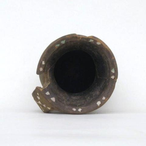 Jarro simétrico, estructura restringida con cuello, perfil compuesto con punto de esquina en unión cuello-cuerpo. Forma de cuerpo esférico. Forma de cuello semi-hiperboloide. Tipo de borde evertido. Tipo de labio convexo/biselado. Tipo de base plana-definida. Un asa en arco de correa, de sección rectangular, emplazamiento borde/sección superior del cuerpo. Tratamiento de superficie exterior: pulido. Tratamiento de superficie interior del cuello: pulido, del cuerpo: alisado. Color exterior e interior café oscuro. Decoración mediante aplicaciones de fragmentos de loza en el borde y mitad superior de asa, insinuación de incisión anular en el sector cuello-cuerpo y alargamiento, redondeamiento y levantamiento del extremo del asa.