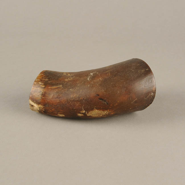Contenedor restringido elaborado en asta de animal, posiblemente buey. De forma troncocónica con base plana sellada por una pieza cilíndrica de madera. Superficie lisa pero con imperfecciones y de color café rojizo.