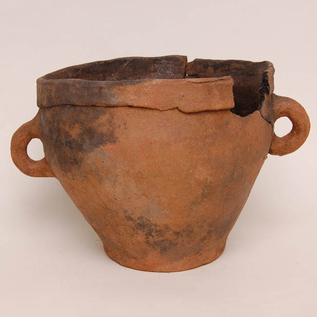 Vasija simétrica no restringida de perfil simple. Presenta b orde reforzado recto de labio redondeado. Base plana y levemente ovalada, en suave pedestal. Cuenta con dos asas en arco lisa (sección circular) emplazadas verticalmente, bajo el reborde. Superficie alisada, de color anaranjado, variando a pardo.