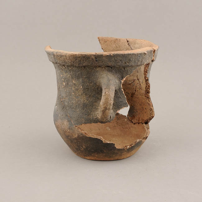 Contenedor restringido de perfil compuesto. Tiene labio redondeado con reborde, cuello cilíndrico, cuerpo globular y base plana. Posee un asa anular de cuello a cuerpo, Cerámica modelada, alisada y pulida de color marrón oscuro.