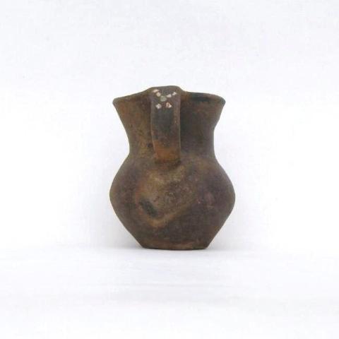 Jarro simétrico, estructura restringida con cuello, perfil complejo (con dos puntos de esquina: uno en la unión cuello-cuerpo y otro en el diámetro máximo del cuerpo). Forma de cuerpo bitroncocónico. Forma de cuello semi hiperboloide. Tipo de borde evertido. Tipo de labio biselado. Tipo de base plana-definida. Un asa en arco de correa, de sección subrectangular, emplazamiento borde/unión cuello-cuerpo. Tratamiento de superficie exterior: pulido. Tratamiento de superficie interior: cuello pulido, cuerpo alisado. Color exterior e interior: café oscuro. Presenta incrustaciones de cerámica vidriada en el labio (9) y en el asa (7), una de ellas verde, el resto de color blanco. Presenta alargamiento de ambos extremos del asa, además el extremo inferior ha sido redondeado y levantado.