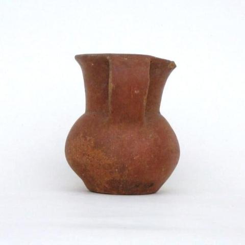 Jarro simétrico, estructura restringida con cuello, perfil compuesto con punto de esquina en la unión cuello-cuerpo. Forma de cuerpo elipsoide horizontal. Forma de cuello semihiperboloide. Tipo de borde evertido. Tipo de labio convexo/biselado. Tipo de base plana-definida. Un asa en arco de correa, de sección subrectangular, emplazamiento borde/sección superior del cuerpo. Tratamiento de superficie exterior: engobado y pulido, base: alisada. Tratamiento de superficie interior: borde y mitad superior del cuello, engobado y pulido; cuerpo y mitad inferior del cuello: alisado. Color exterior: rojo. Color interior: rojo y café anaranjado.