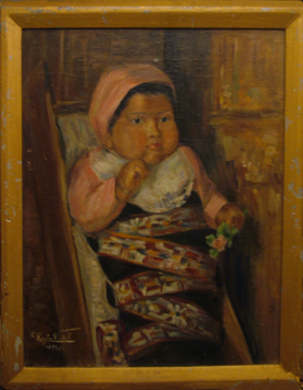 Obra bidimensional, de formato rectangular y orientación vertical. Composición en base a figura humana completa de infante mostrando su medio perfil derecho en primer plano, y cuya vestimenta presenta una variedad cromática que incluye rosados, rojos, verdes y valores blancos y negros. En el infante retratado, que aparece atado a un armazón de transporte, destacan el rostro y las manos, una de las cuales, la izquierda, lleva una flor. El fondo, en segundo plano, está configurado por pinceladas gruesas donde predomina una paleta de color marrón, matizada con gamas de grises, blancos, rojos y verdes. El marco de la obra es de madera pintada de un color marrón claro que se ha ido desprendiendo, dejando entrever el gris de una pintura anterior.