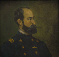 Obra de formato cuadrado. Composición en base a un busto masculino de perfil de cabello oscuro con barba y bigote. Viste uniforme militar de color azul con decoraciones en color dorado.