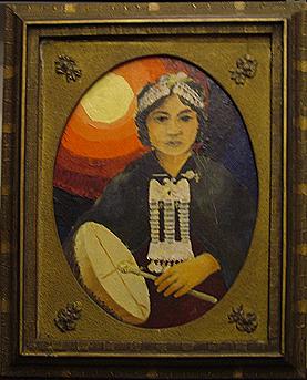 Obra de formato ovalado. Composición en base a una figura femenina de frente de medio cuerpo. Sostiene al lado izquierdo un objeto circular y con la otra mano un elemento alargado. Viste una manta de color negro con un adorno pectoral, en la cabeza lleva un tocado.
