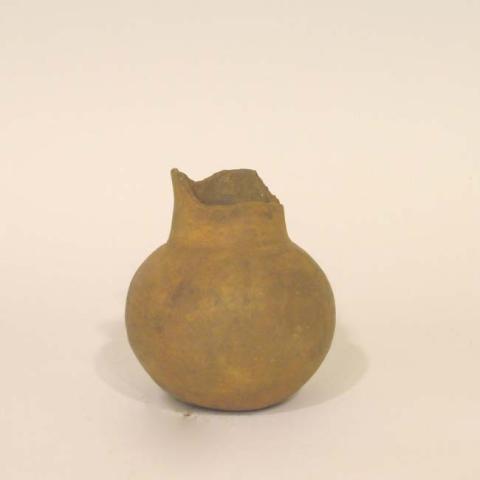 Vasija simétrica de cuerpo globular, de estructura restringida con cuello y perfil inflectado. Labio redondeado, borde evertido, cuello hiperboloide, cuerpo esférico y base plana. Posee un asa cinta de sección rectangular que nace bajo el borde y se extiende hasta donde comienza el cuerpo. Superficie alisada de color café.