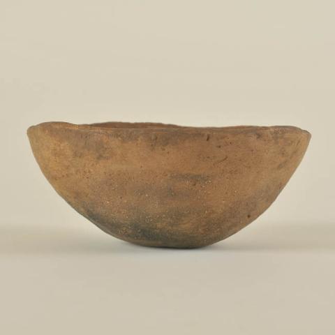 Vasija simétrica de estructura no restringida de perfil simple. Labio plano, borde recto, cuerpo semicircular y base plana. Superficie alisada de color café.