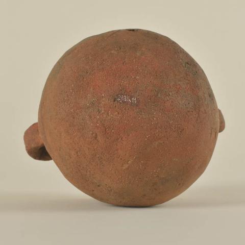 Vasija simétrica de cuerpo globular, de estructura restringida con cuello y perfil inflectado. Labio plano, borde evertido, cuello hiperboloide, cuerpo esférico y base convexa. Posee dos asas cintas de sección elipsoidal que nacen bajo el labio y se extienden hasta donde comienza el cuperpo. Superficie pulida con posible baño de color rojo. En la base del cuello posee un linea incisa que lo recorre en su diámetro.