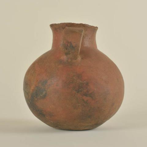 Vasija simétrica de cuerpo globular, de estructura restringida con cuello y perfil compuesto. Labio redondeado, borde evertido, cuello cilíndrico, cuerpo esférico y base plana. Posee un asa cinta de sección rectangular que nace bajo el labio y se extiende hasta donde comienza el cuerpo. Superficie pulida con engobe rojo.